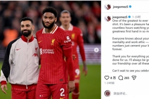 乔·戈麦斯社媒晒出与萨拉赫的合照,并写道:“你是身穿这件球衣的最伟大球员之一。能有无数小时亲眼见证你在方方面面的卓越表现,这是我的荣幸。”
