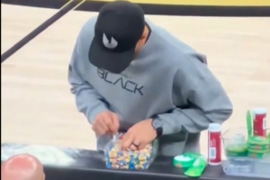 体育资讯3月27日讯 昨日勇士109-106战胜篮网,有网友的镜头捕捉到库里在场边偷偷藏糖果一幕。