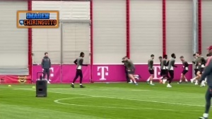 据西班牙六台报道,拜仁今日在对阵皇马比赛前的最后一次训练中气氛良好。在球员热身时还有音响在球场中播放音乐。